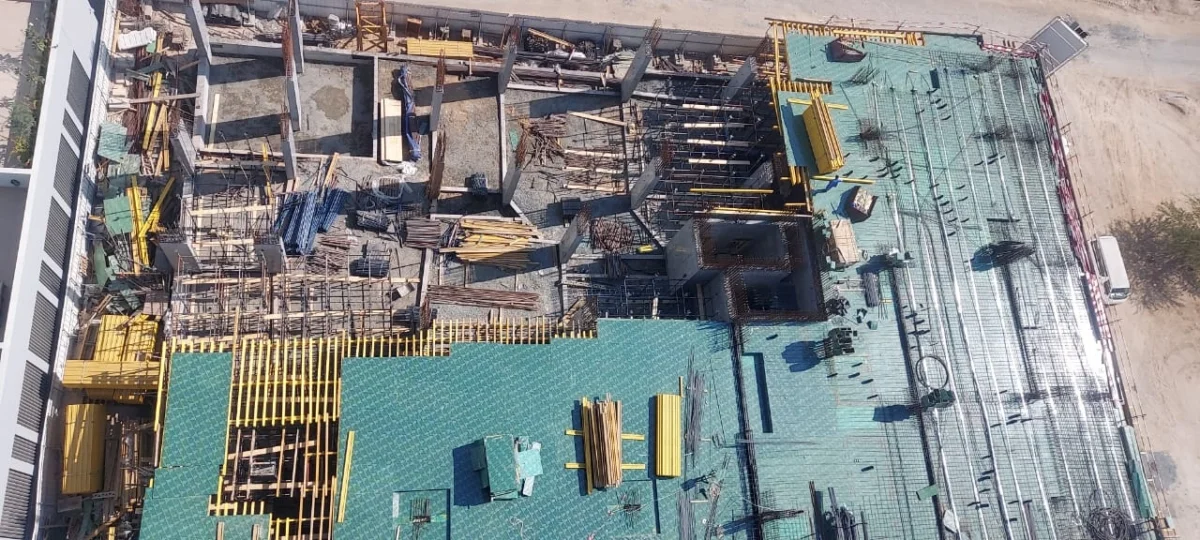- صب الأعمدة والجدران الخاصة ببلاطة الطابق الثالث، اكتمل التنفيذ بنسبة 20٪