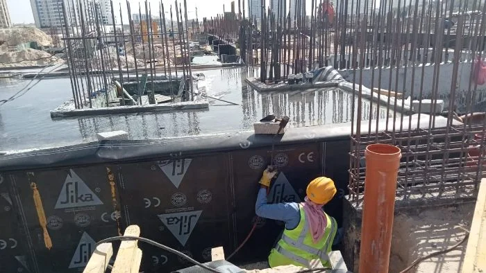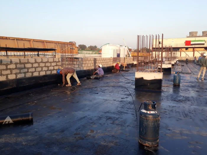 - المرحلة الأولى لعزل اللبشة (فوق الخرسانة العادية) والجدران الحاجزة، اكتمل التنفيذ بنسبة 50٪.